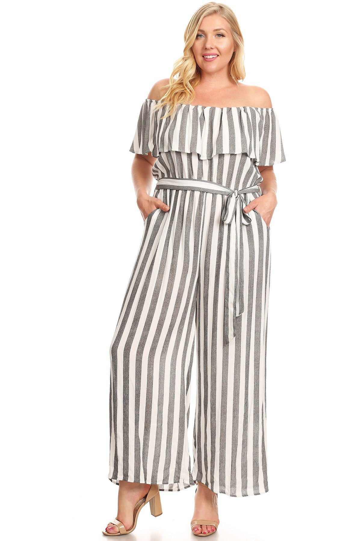 OFF THE SHOULDER STRIPE JUMPSUIT WITH TIE BELT